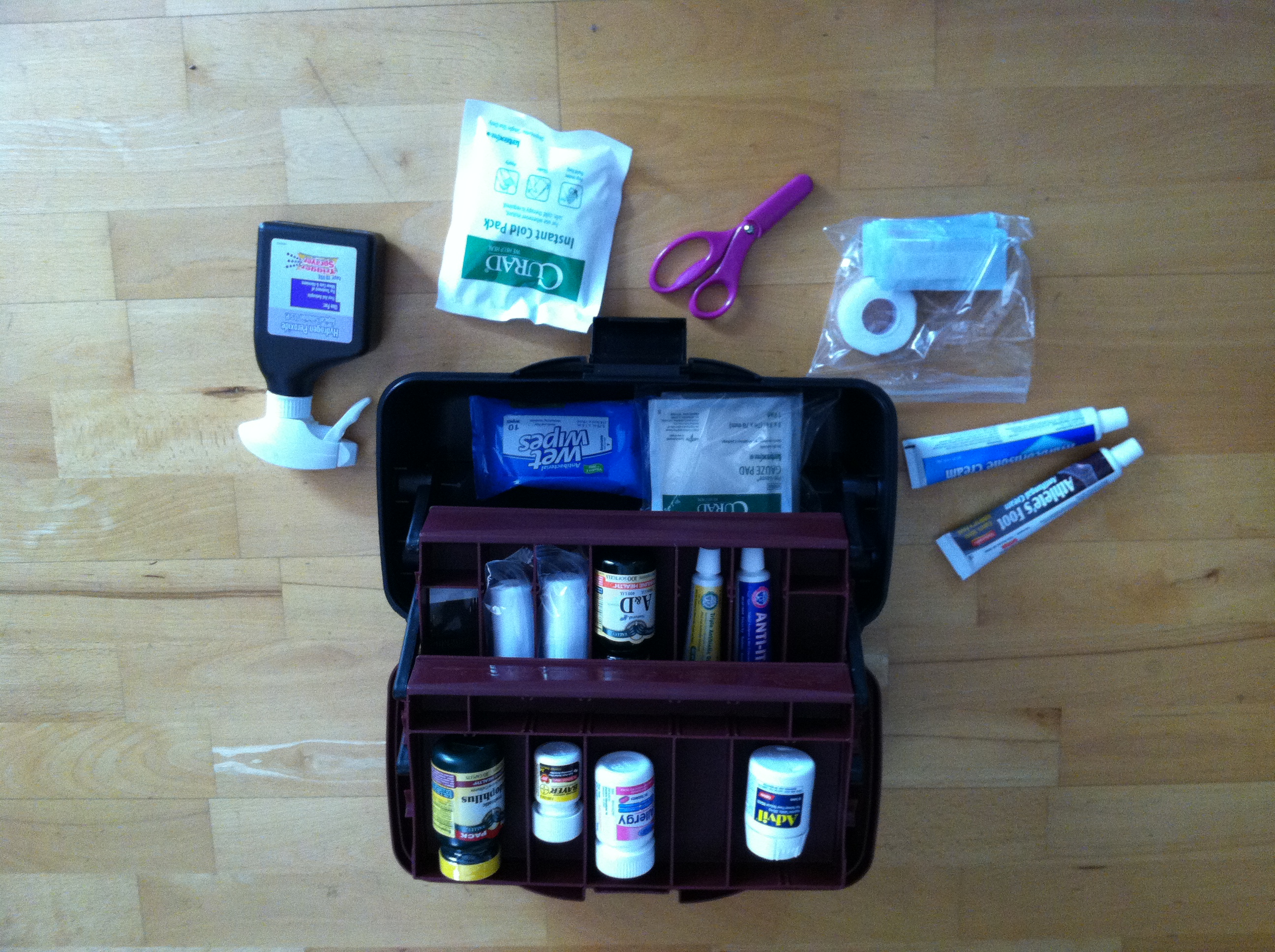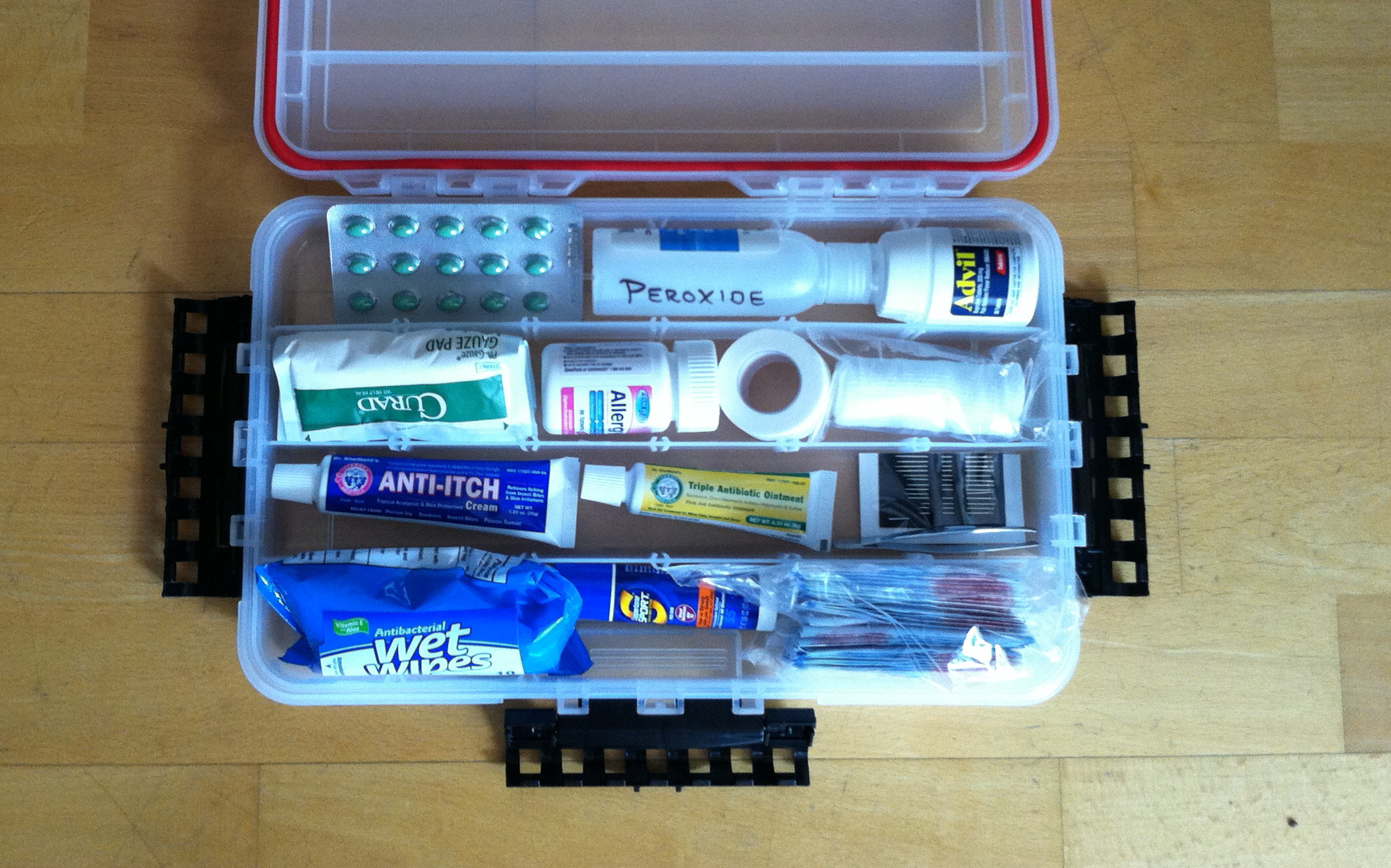 On the lighter side we post this month about the contents of The E.R.B. First Aid Kit. To start, we purchased a Burgundy Flambeau Outdoors fishing tackle box from Walmart for under $10. This box will tackle some hefty banging around and the layered trays are perfect for small bottles. You will find our first aid kid tackle box is equipped differently than most. We found our local pharmacists to be important resources in stocking our first aid boxes. If we run into questions, we will be back to ask questions. Here’s what we accumulated: